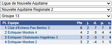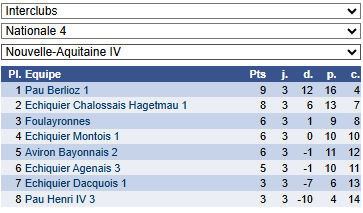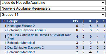 Dimanche 7 décembre 2025 – Résultats 17 December 202517 December 2025| Categories: Non classé En nationale 4, l’équipe arrache le nul. En régionale: Post navigation PREVIOUS Previous post: Dimanche 30 novembre 2025 – nationale 3 jeunesNEXT Next post: Dimanche 14 décembre 2025 – Championnat des Landes